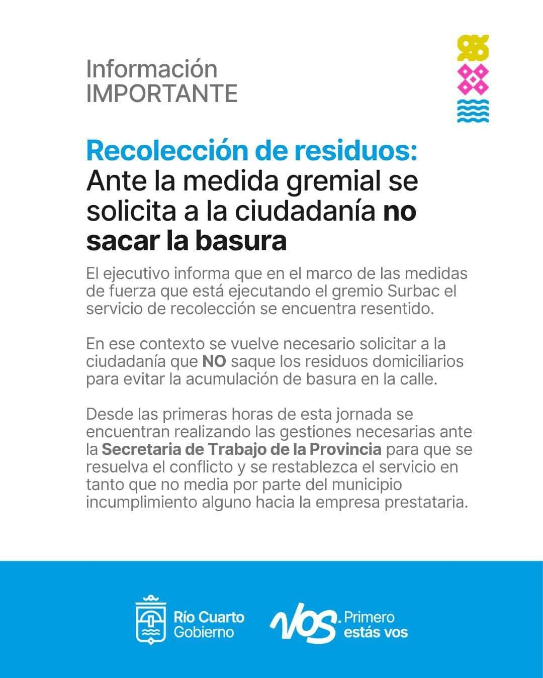 Comunicado del Municipio: «El ejecutivo informa que en el marco de las medidas de fuerza que está ejecutando el gremio Surbac el servicio de recolección se encuentra resentido.En ese contexto se vuelv...