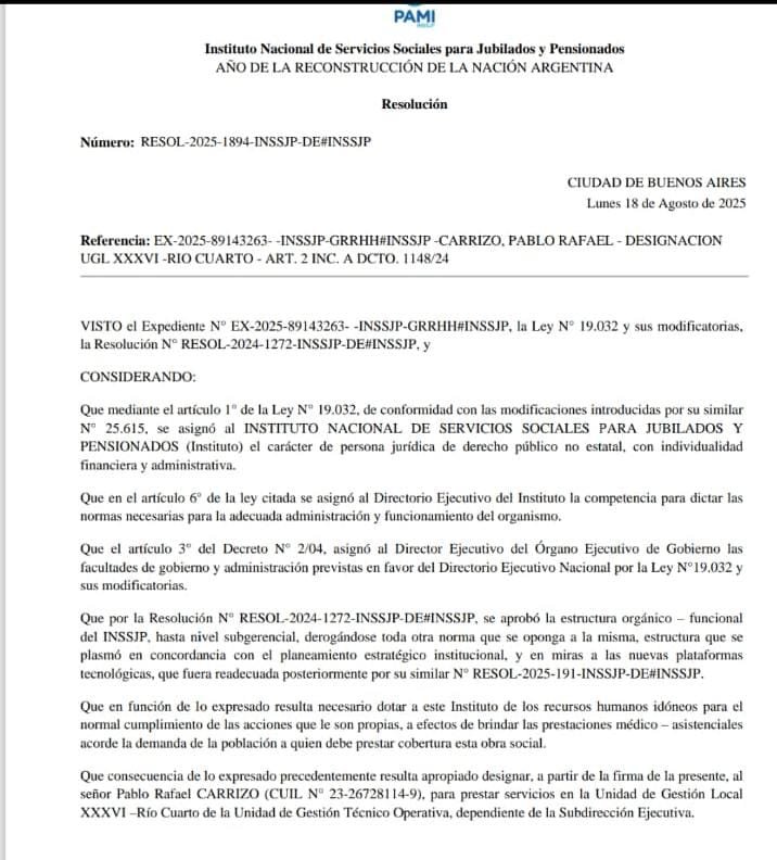 La resolución se difundió este lunes 18 de agosto y señala textualmente: «resulta apropiado designar, a partir de la firma de la presente, al señor Pablo Rafael CARRIZO, para prestar servicios en la Unidad de Gestión Local XXXVI – Río Cuarto de la Unidad de Gestión Técnico Operativa, dependiente de la Subdirección Ejecutiva».