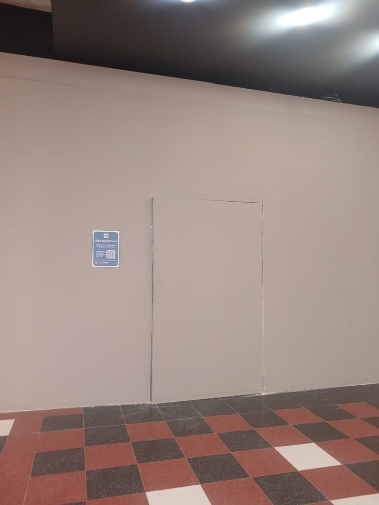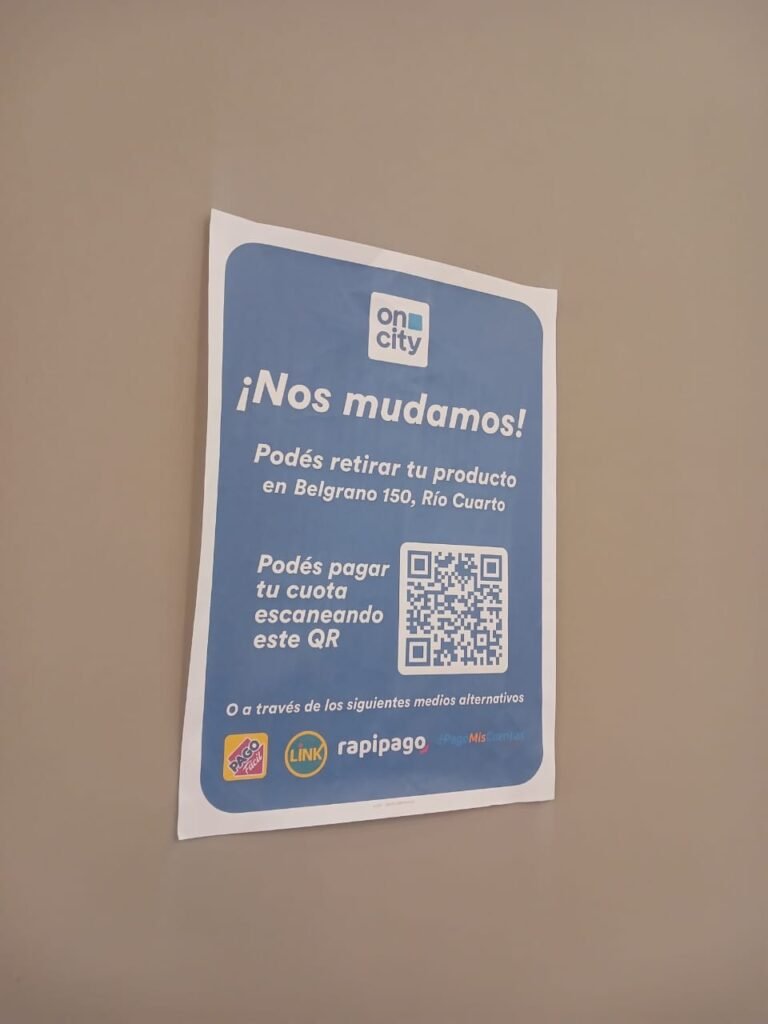 Desde el exterior se observan las cortinas metálicas bajas y en el interior del shopping, ya se ve revestido todo el frente del local. Se exhibe un cartel que señala: “¡Nos mudamos! Podés retirar tu producto en Belgrano 150, Río Cuarto”, también figura un QR para pago de cuotas y otros medios alternativos de pago.