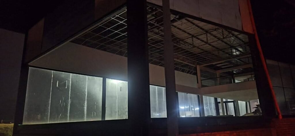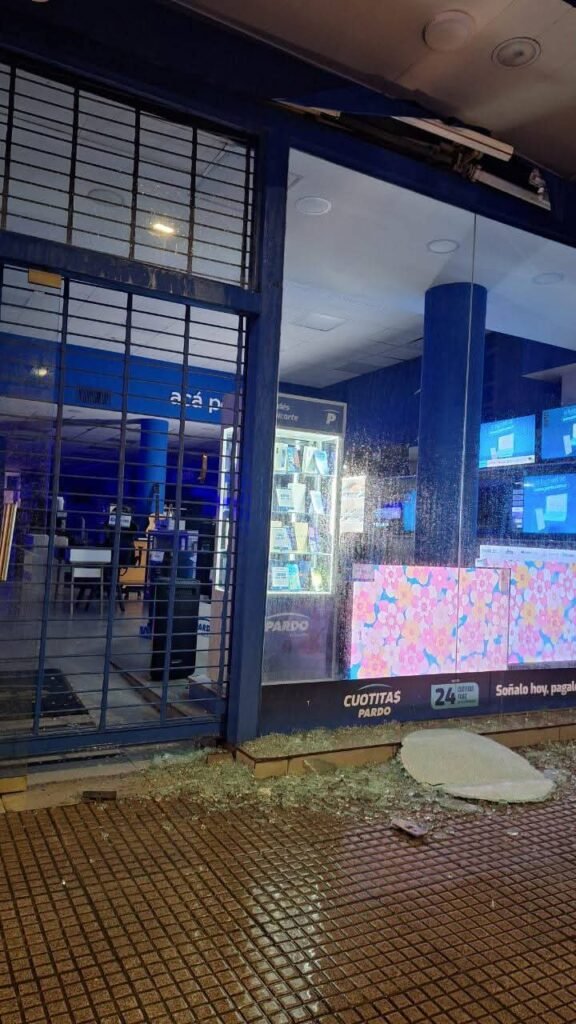 Se registraron daños en la estructura de varios locales comerciales. En el Complejo Mercomax y en un local comercial céntrico, los vientos provocaron la rotura de vidrios.