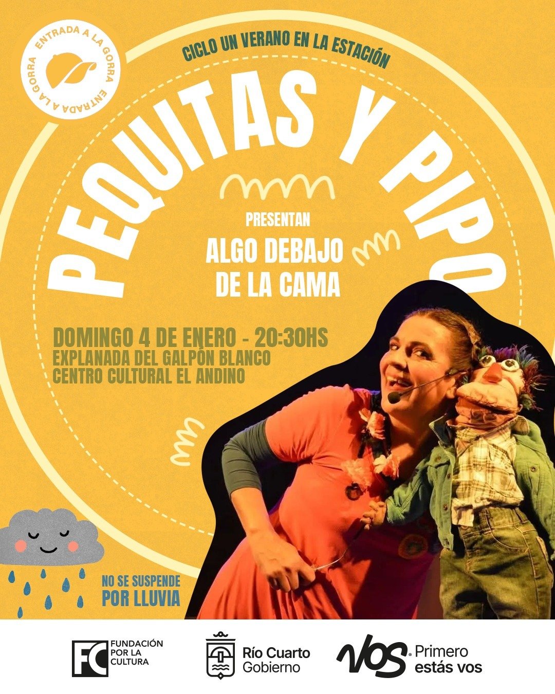 DOMINGO 04 DE ENERO20.30hs. Explanada del Galpón Blanco C.C Andino. Entrada a la gorra. No se suspende por lluvia.CICLO UN VERANO EN LA ESTACIÓN.PEQUITAS Y PIPO presentan “ALGO DEBAJO DE LA CAMA”. MIÉ...